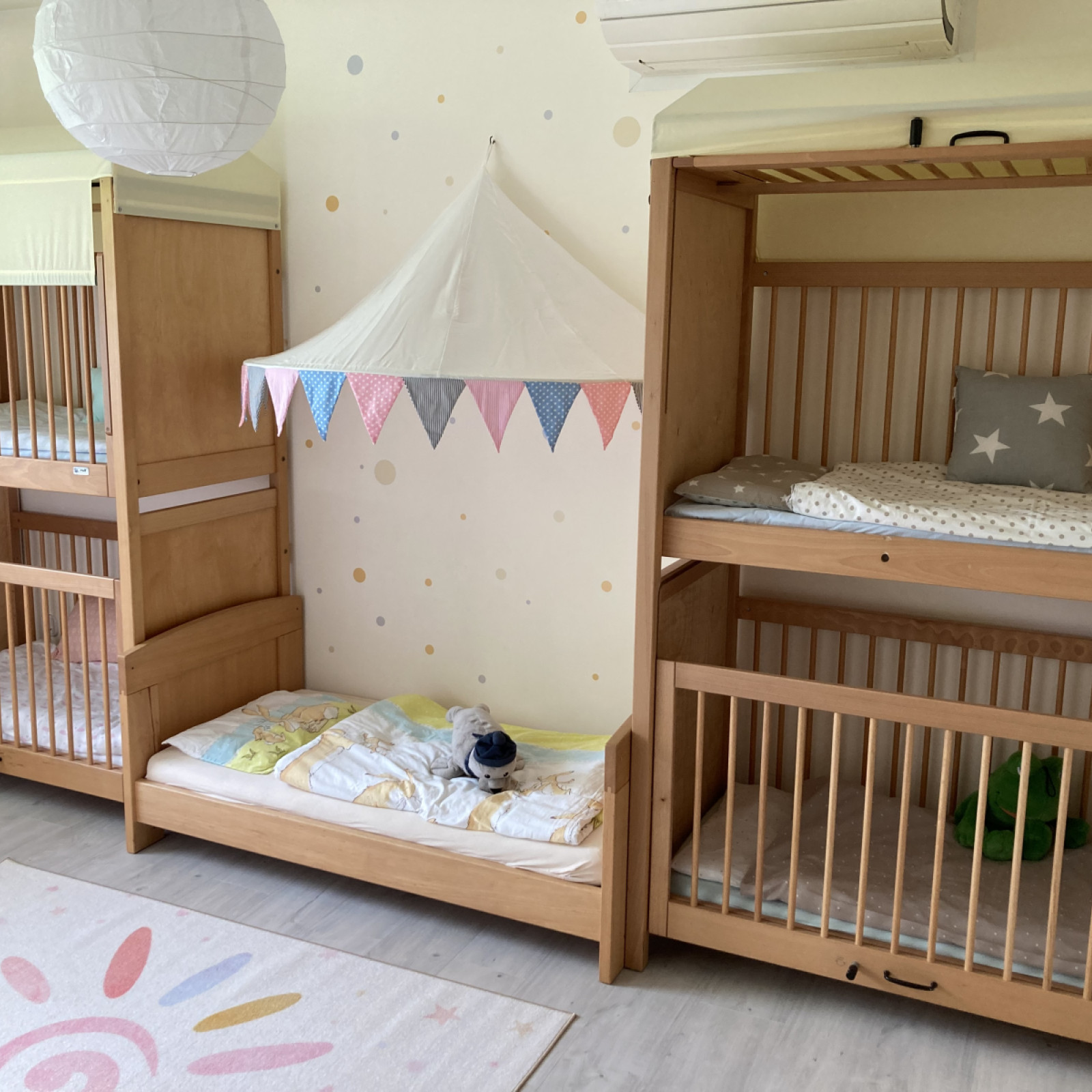 Kinder haben besondere Bedürfnisse an die Einrichtung:. Für den Mittagsschlaf oder um sich auszuruhen gibt es den Schlafbereich mit einer eigenen Matratze und Bett für jedes Kind. Die Küche ist besonders wichtig: hier bereiten wir – auch oft gemeinsam mit den Kindern – die Mahlzeiten zu und lassen es uns zusammen am großen Tisch schmecken. In den Räumen gibt es verschiedene Bereiche zum Basteln oder Spielen – mache Bereiche werden auch für verschiedene Anlässe umgeräumt. In den Räumen wird natürlich nicht geraucht.